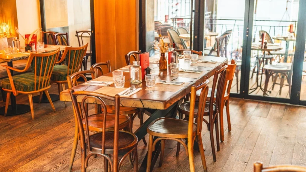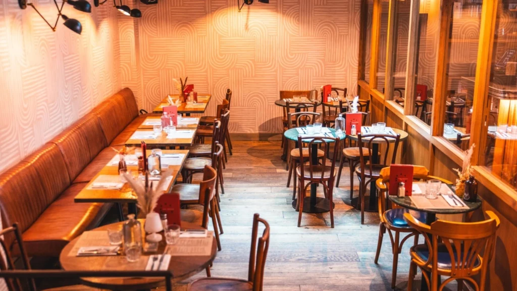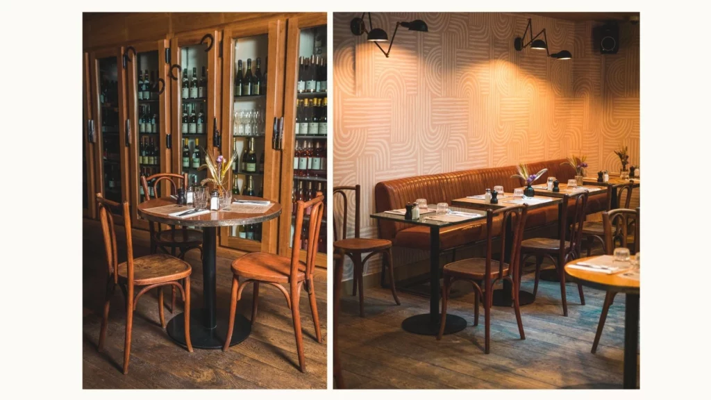Autrefois froide, elle a gagné en chaleur et convivialité avec l’ajout d’une banquette sur-mesure, de détails en bois et surtout de serres végétalisées. Celles-ci structurent l’espace, créent une respiration visuelle entre les convives et offrent à certaines tables une véritable sensation d’intimité et de confidentialité.