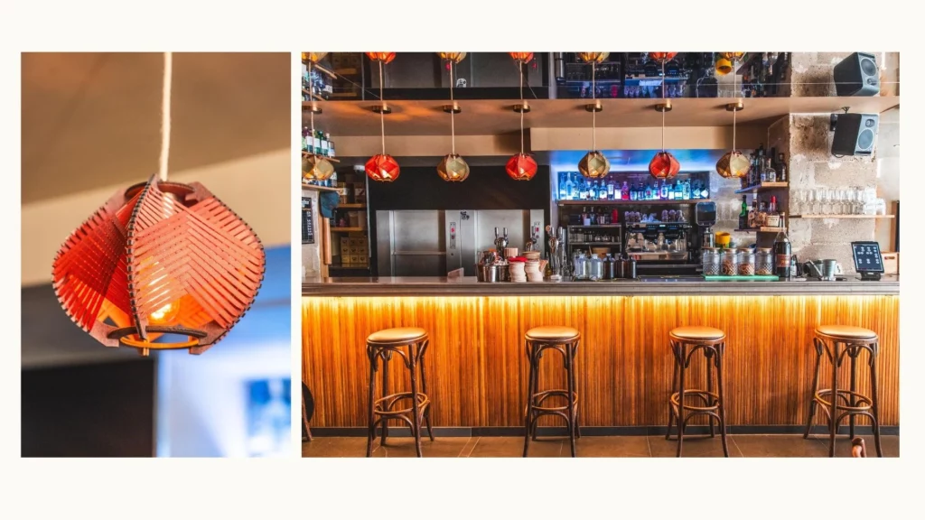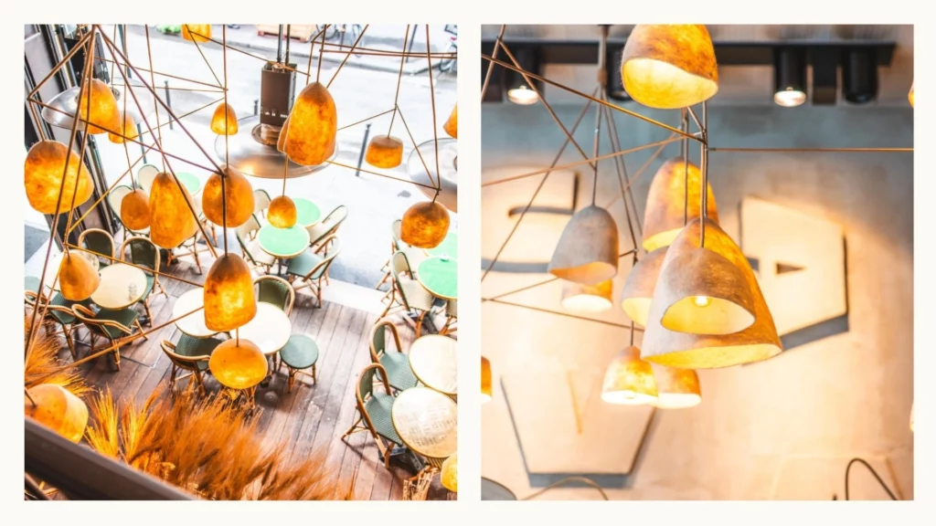 La lumière joue un rôle majeur dans l’identité du lieu. Des suspensions majestueuses signées Po! Paris créent une atmosphère reposante et chaleureuse : leur laine, issue uniquement de la tonte de fin d’été, est patiemment feutrée pour donner aux lampes à la fois finesse et fermeté, tout en filtrant délicatement la lumière. Les jeux de reflets avec les miroirs amplifient cette luminosité et ouvrent les volumes. Enfin, au comptoir, des suspensions artisanales de Studio Numéroté apportent une touche colorée et singulière. Fabriquées à Lyon et tissées à la main, elles incarnent l’excellence artisanale et la personnalisation sur mesure.