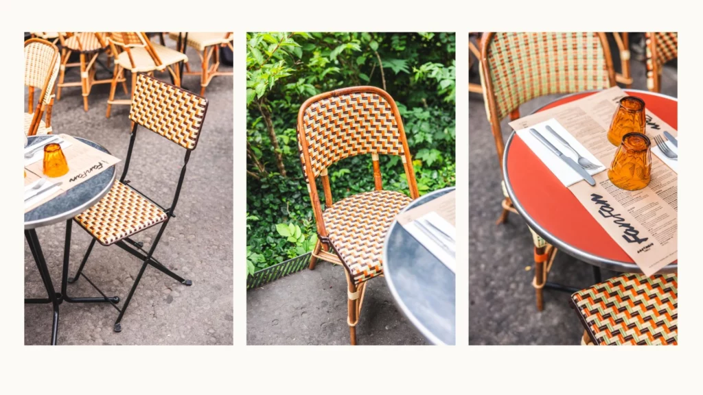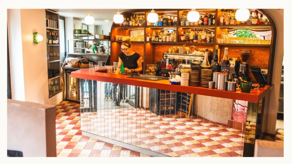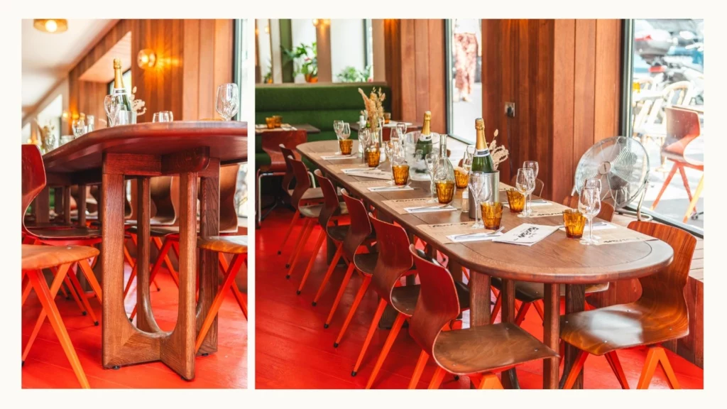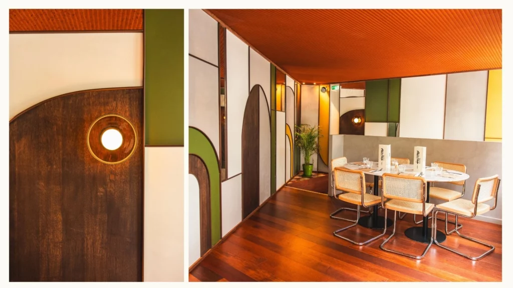 Des matériaux comme le mélaminé pour la piste du bar ou certains plateaux de table rappellent avec subtilité l’univers des années 70. Le lieu se nourrit d’un mélange d’authenticité et de réinterprétation contemporaine, créant une ambiance unique, chaleureuse et conviviale.