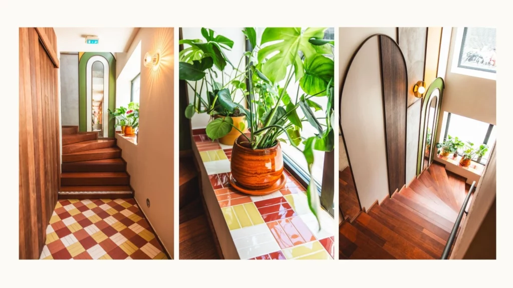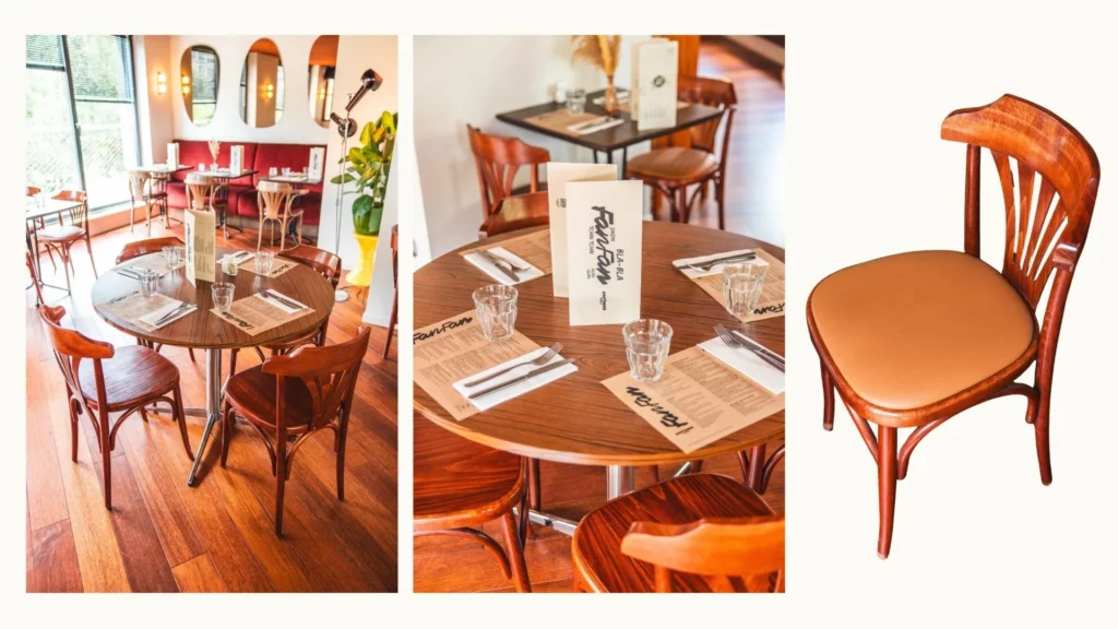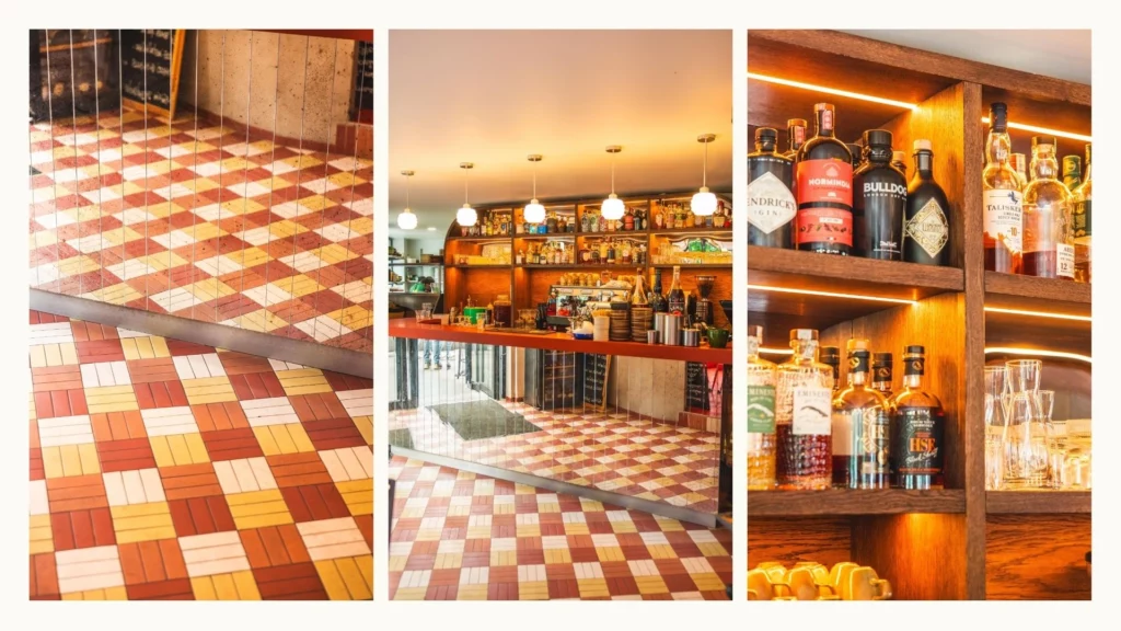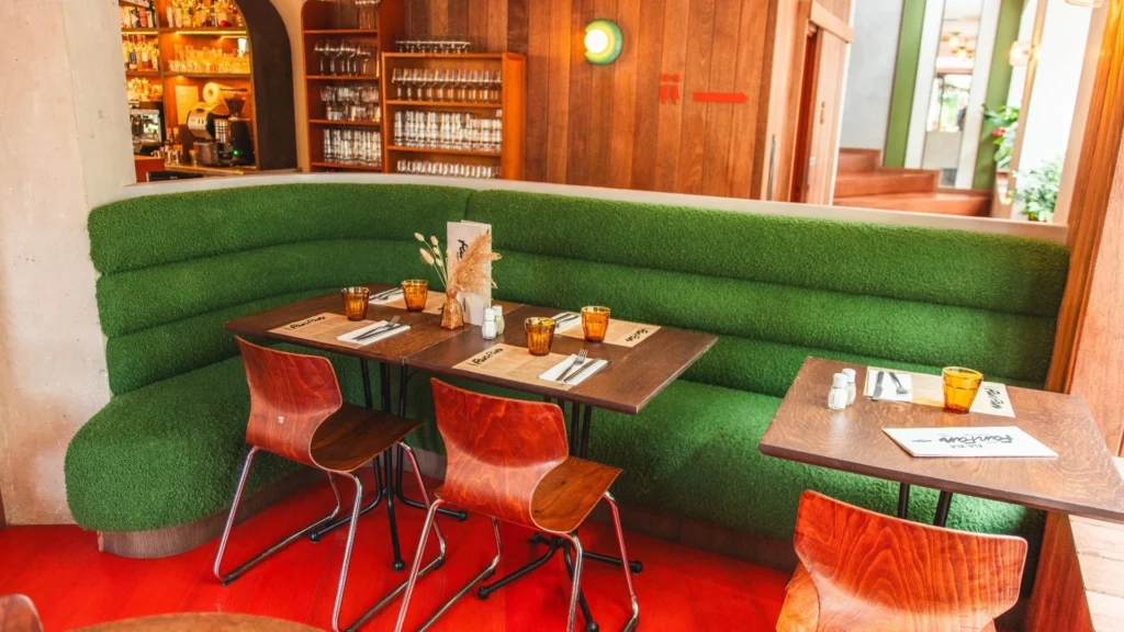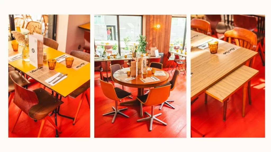 Le choix du parquet orange fut un pari audacieux et payant : il a donné à Fanfan une identité forte et immédiatement reconnaissable. Il dialogue avec un carrelage coloré dans le sas d’entrée, dont les jeux de miroir au bar renforcent l’éclat. Le lambris et des teintes chaudes complètent cette palette seventies, vivante et joyeuse.