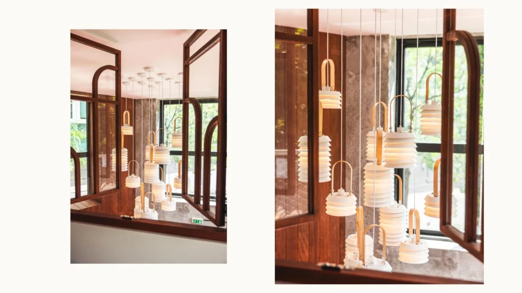 Véritable pièce maîtresse, la verrière lumineuse combine miroirs, LED intégrées et lignes arrondies. Elle donne au lieu un petit air d’institution parisienne, comme si le restaurant avait toujours existé ici.