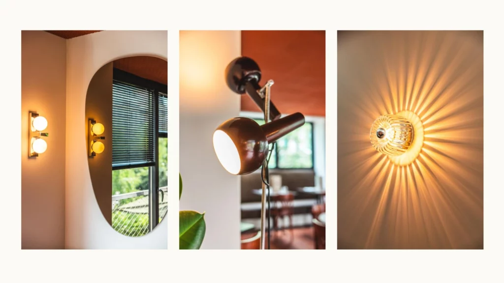 L’éclairage joue un rôle clé. Nous avons chiné des pièces seventies accessibles mais efficaces :