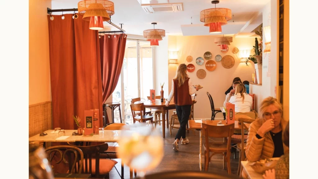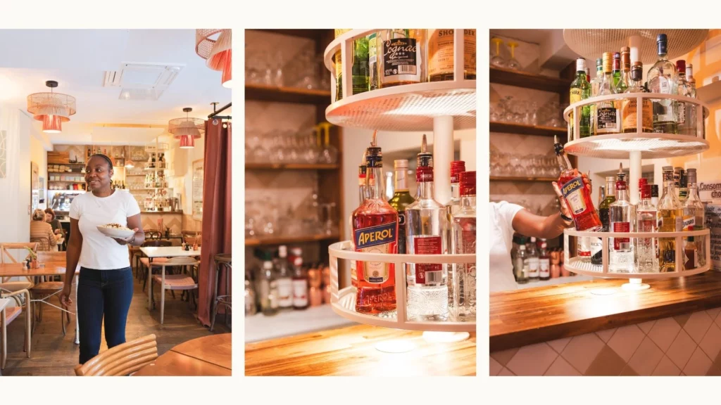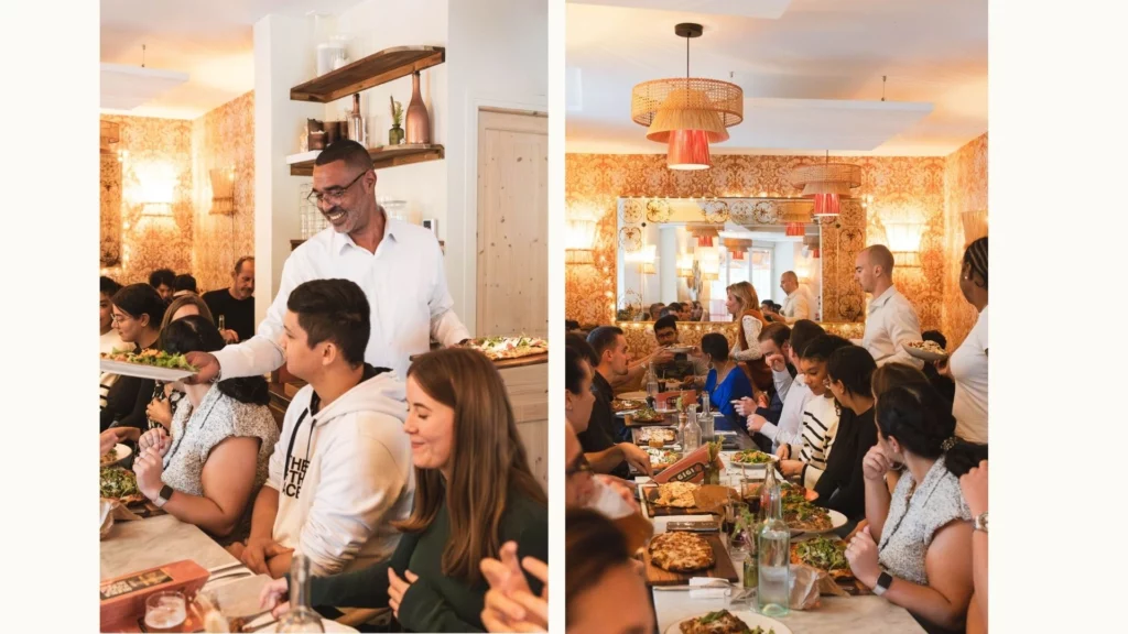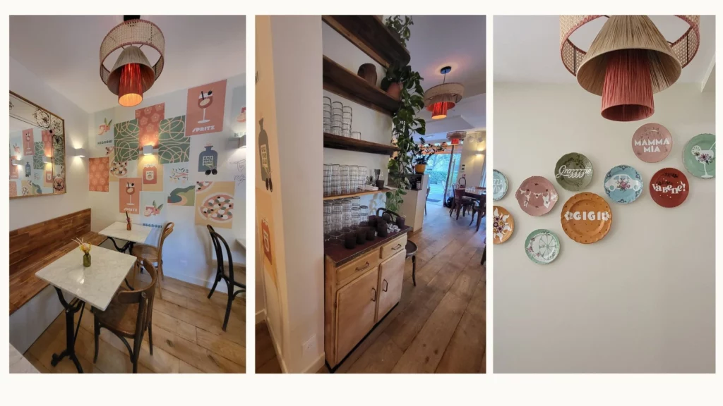 Nous avons conservé l’esprit de cantine italienne joyeuse tout en adoucissant les codes. Les teintes franches de Clichy ont laissé place à une palette pastelle et lumineuse : des zelliges blancs et beiges, des bois clairs et une atmosphère plus feutrée.