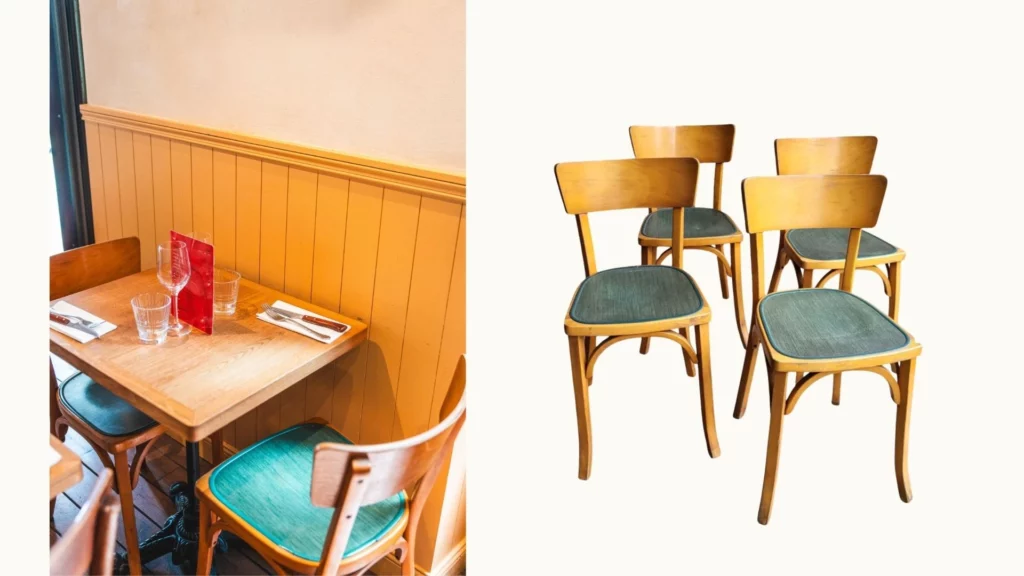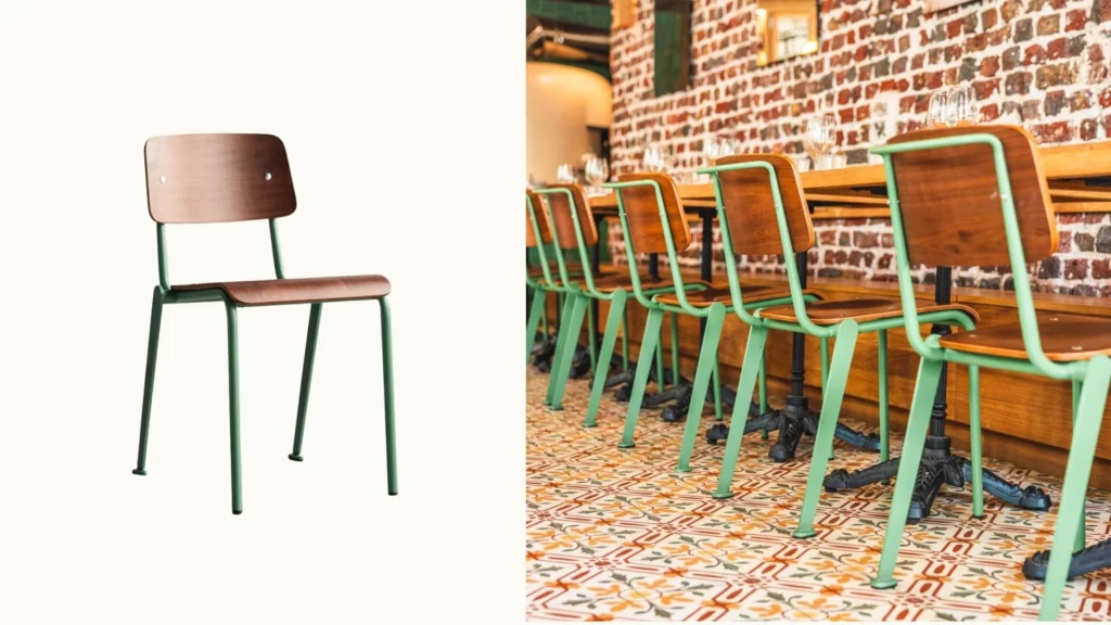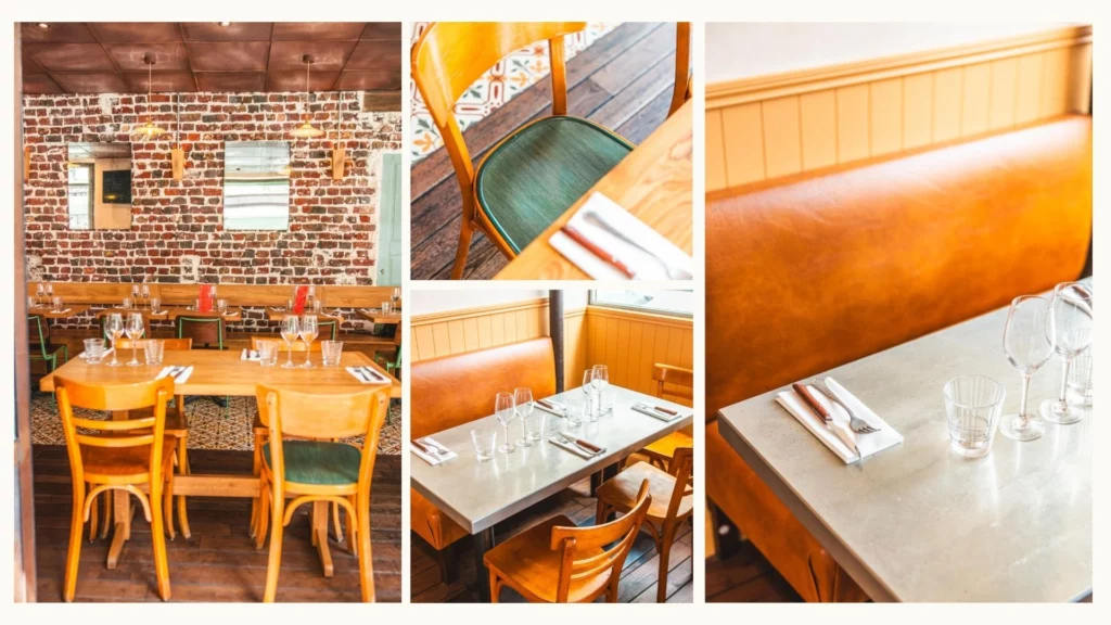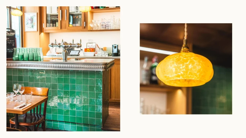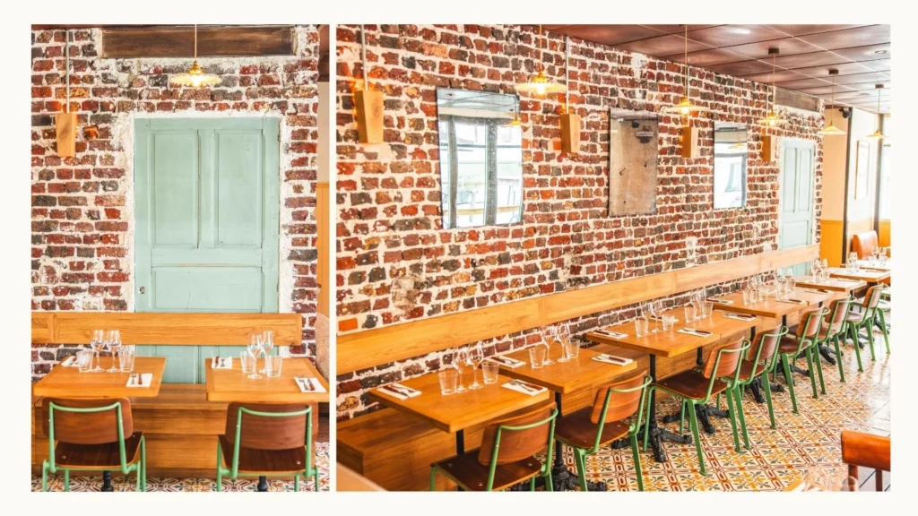 Une partie du revêtement de sol, le mur de briques, l’étain du comptoir et le plafond ont été conservés. Ces éléments patinés racontent l’histoire du lieu et dialoguent avec les nouveaux choix colorés et méditerranéens, tout en servant la maîtrise du budget.