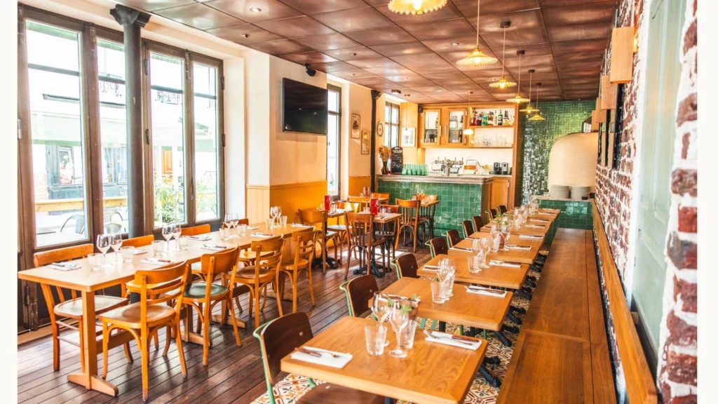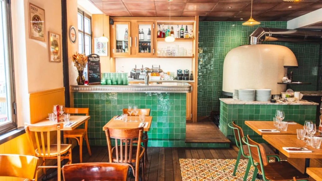 Un bar d’envoi compact a été installé au fond de la salle afin de fluidifier le service. Un four à pizza traditionnel y a également trouvé sa place, devenant à la fois outil central et repère visuel fort de la nouvelle identité du restaurant.